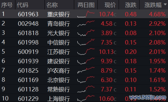 银行股集体走强,建设银行、工商银行、江苏银行、成都银行等盘中再创历史新高;重庆银行全天领涨,盘中一度涨逾7%,收涨4.68%。